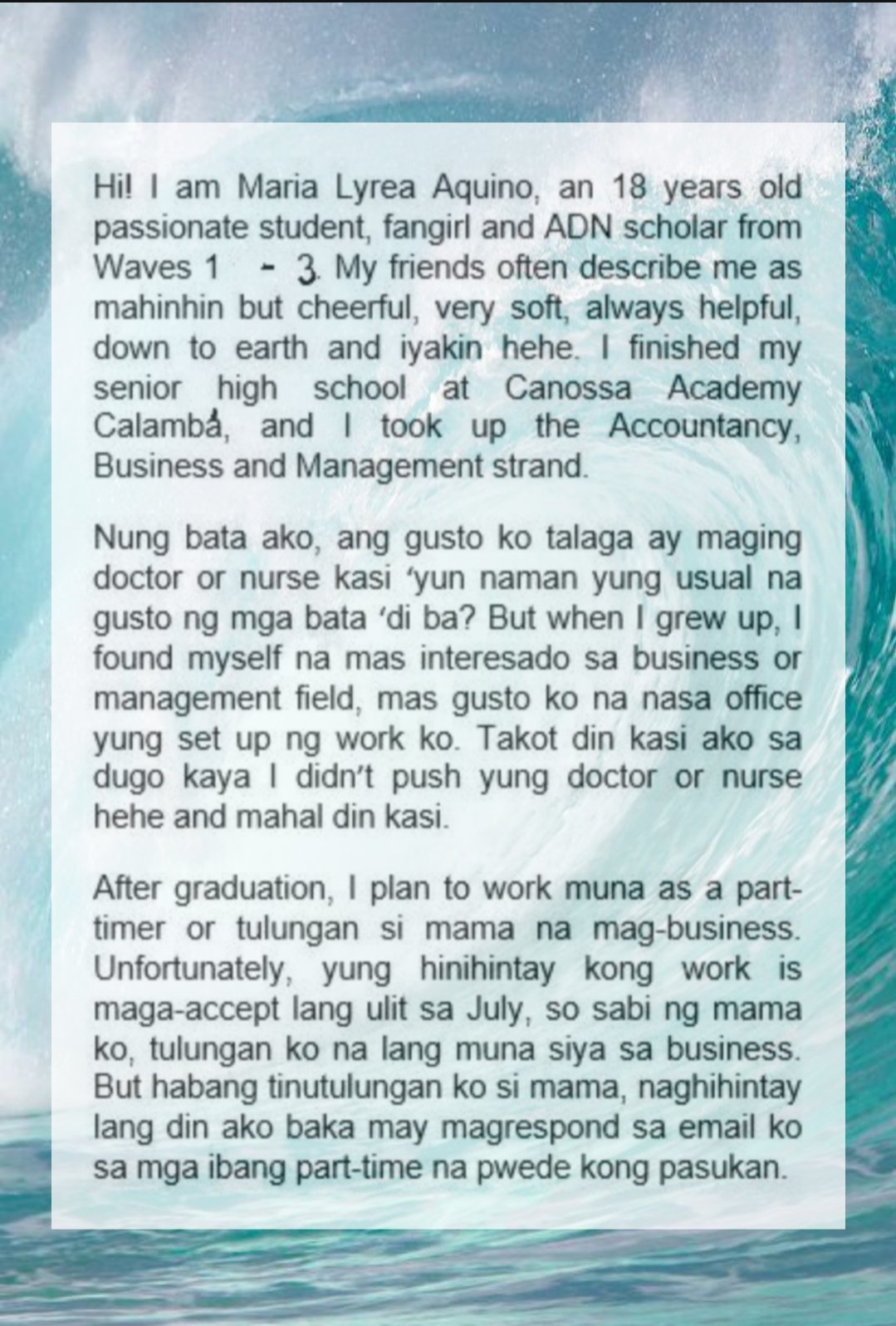Baka kaya tayo iniiwan ng mga taong mahal natin kasi baka may bagong darating na mas okay. Tayong kabataan na may magulang pa ay maiituring na talagang maswerte dahil bawat isa sa atin ay may Ina na naghihintay sa pintuan ng bahay upang itanong ang araw mo Ama na nagpapakahirap sa trabaho maibigay lang ang mga luho iwan man tayo ng lahat kaiklanman ang mga magulang natin ay hinding hindi tayo iiwan. Iwanan ka masasaktan ka din.