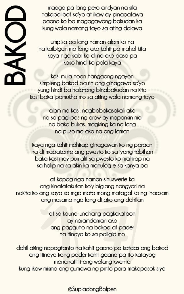Kung minsan ang pag-ibig nandyan lang hindi kinikibo naghihintay na maging paksa ng unang tula na isinusulat ko para sayo. Ang mga katubigan na datiy nilalanguyan. Mga alaala natin ay nabuo lang sa mundong mapagloko Nagpasya na akong wasakin ito Dahil sa ideya ko lang pala nabuo ang salitang tayo.